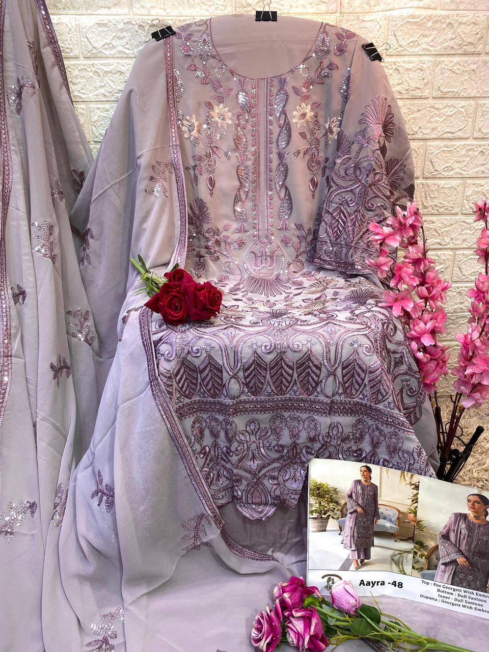The look is completed with a luxurious Georgette dupatta featuring rich embroidery, adding elegance and charm to your outfit. Crafted for festive flair and modern sophistication, Aayra 48 is perfect for weddings, parties, or traditional gatherings.