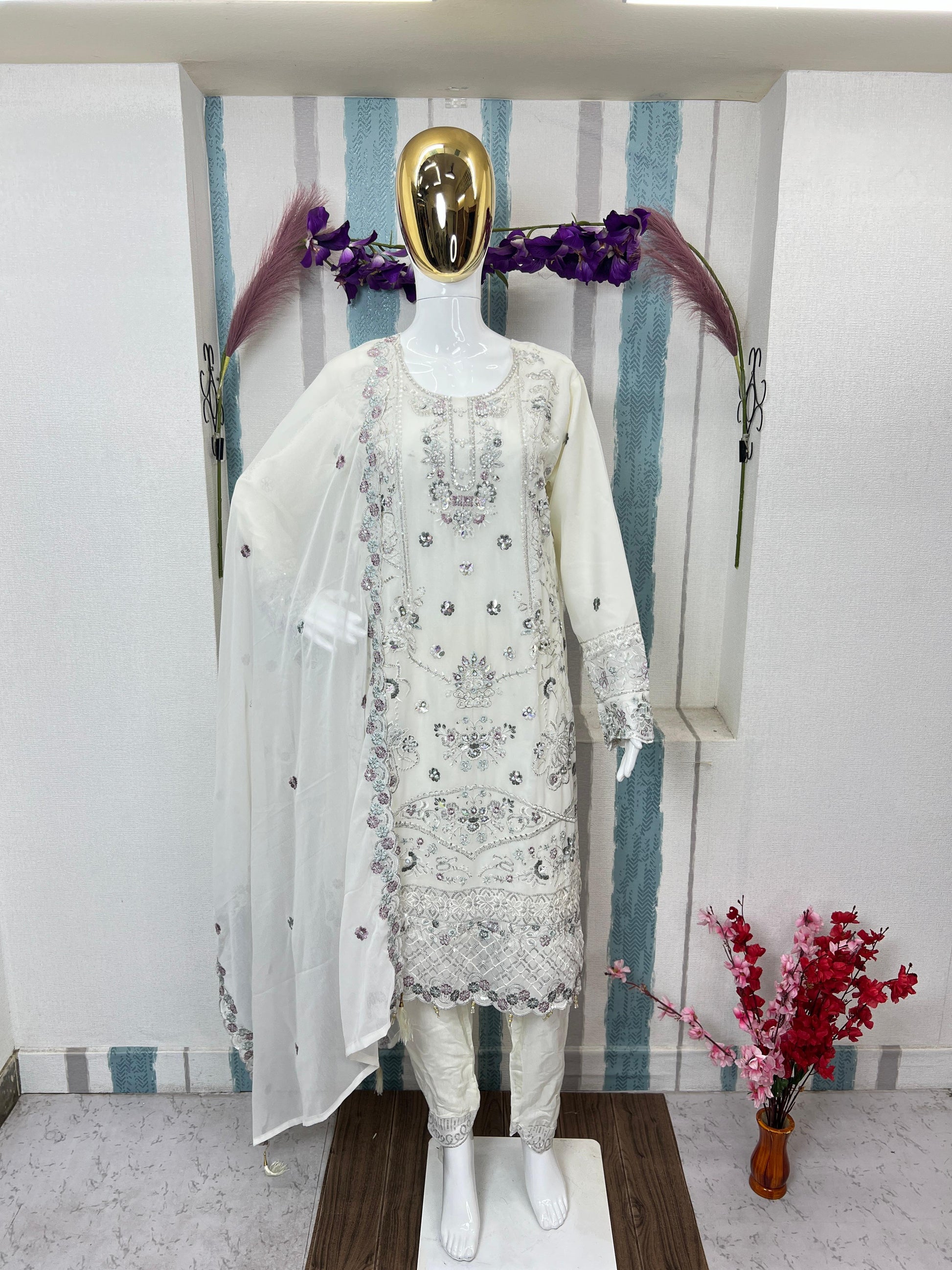 Heavy Georgette fabric beautifully embroidered on both front and back, featuring intricate khatli handwork for a rich designer touch. Comes with a soft dull Santoon inner lining for all-day comfort.