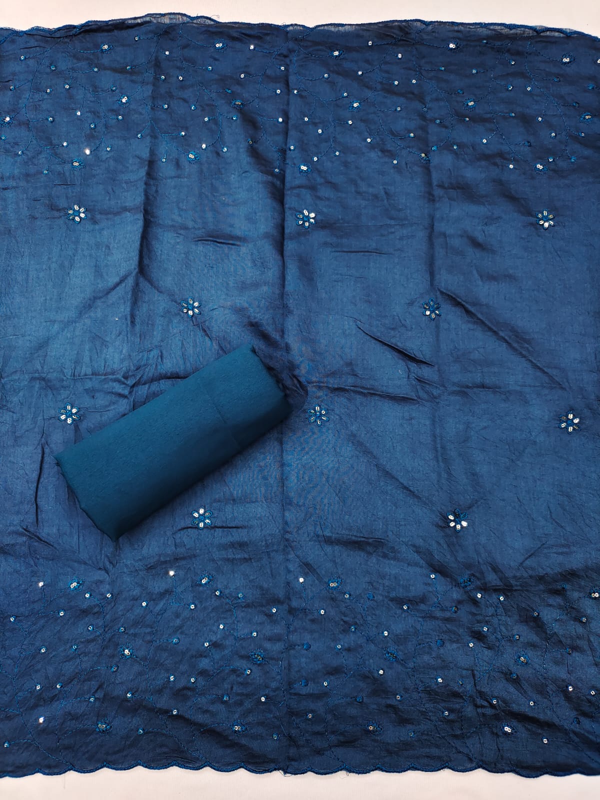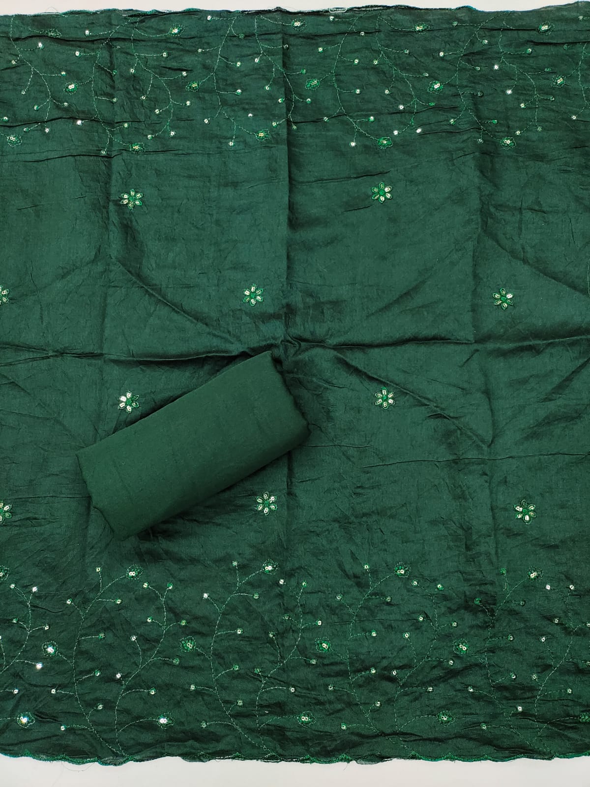 Elevate your ethnic wardrobe with this exquisite unstitched suit set, crafted from premium Chanderi Silk and adorned with intricate embroidery and sequin work. This ensemble seamlessly blends traditional artistry with contemporary elegance, making it a perfect choice for festive occasions and special events.