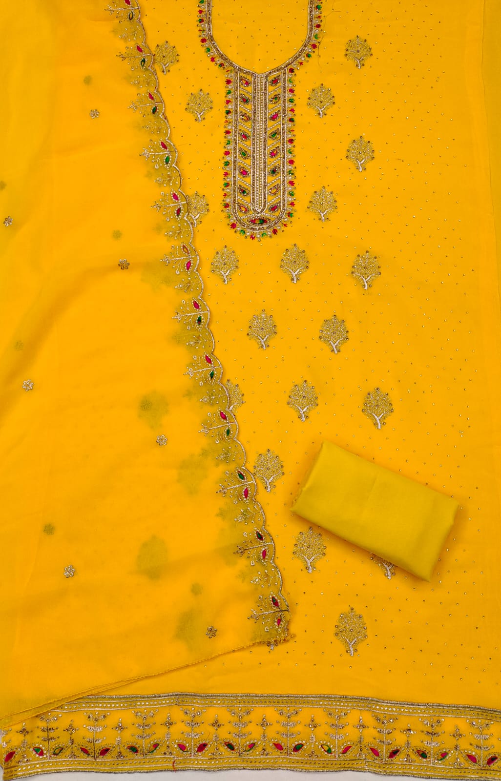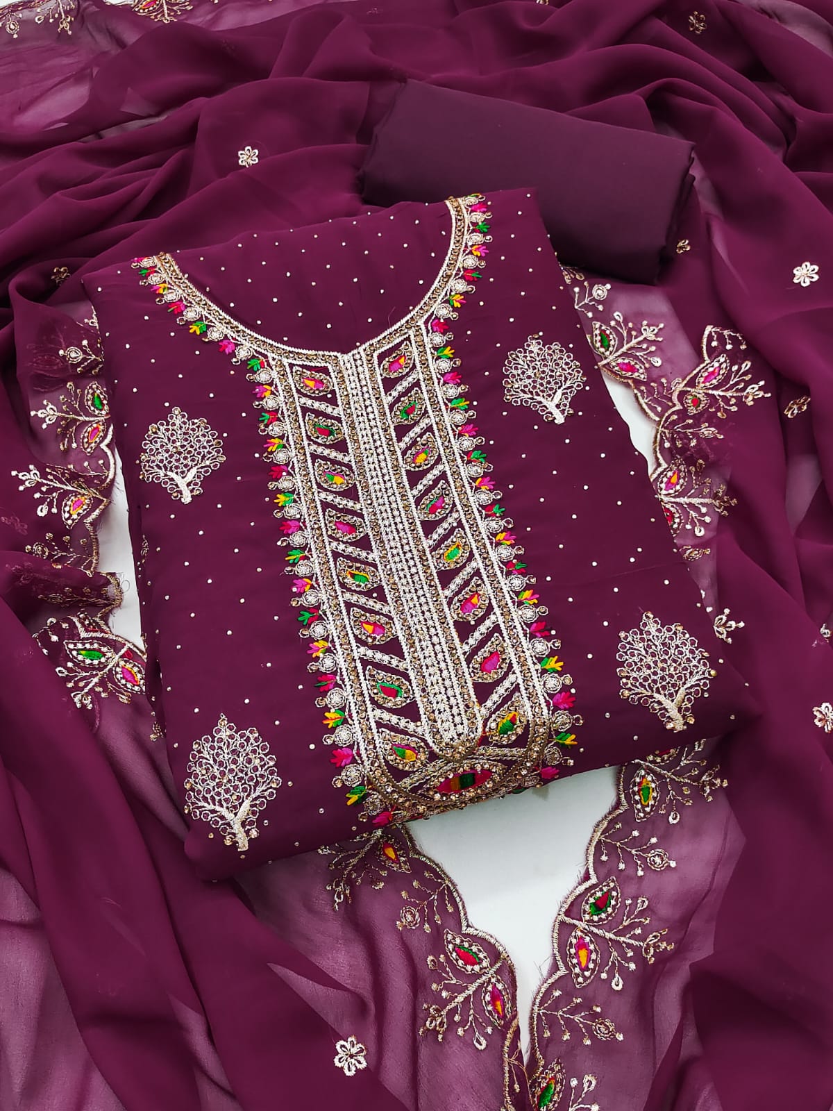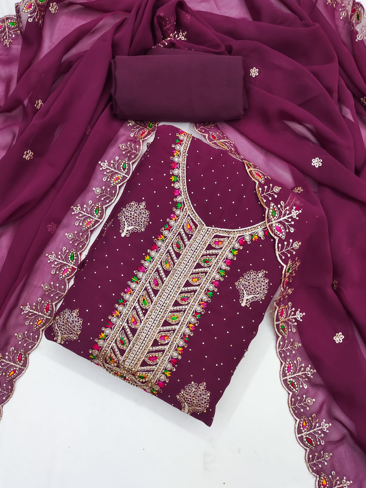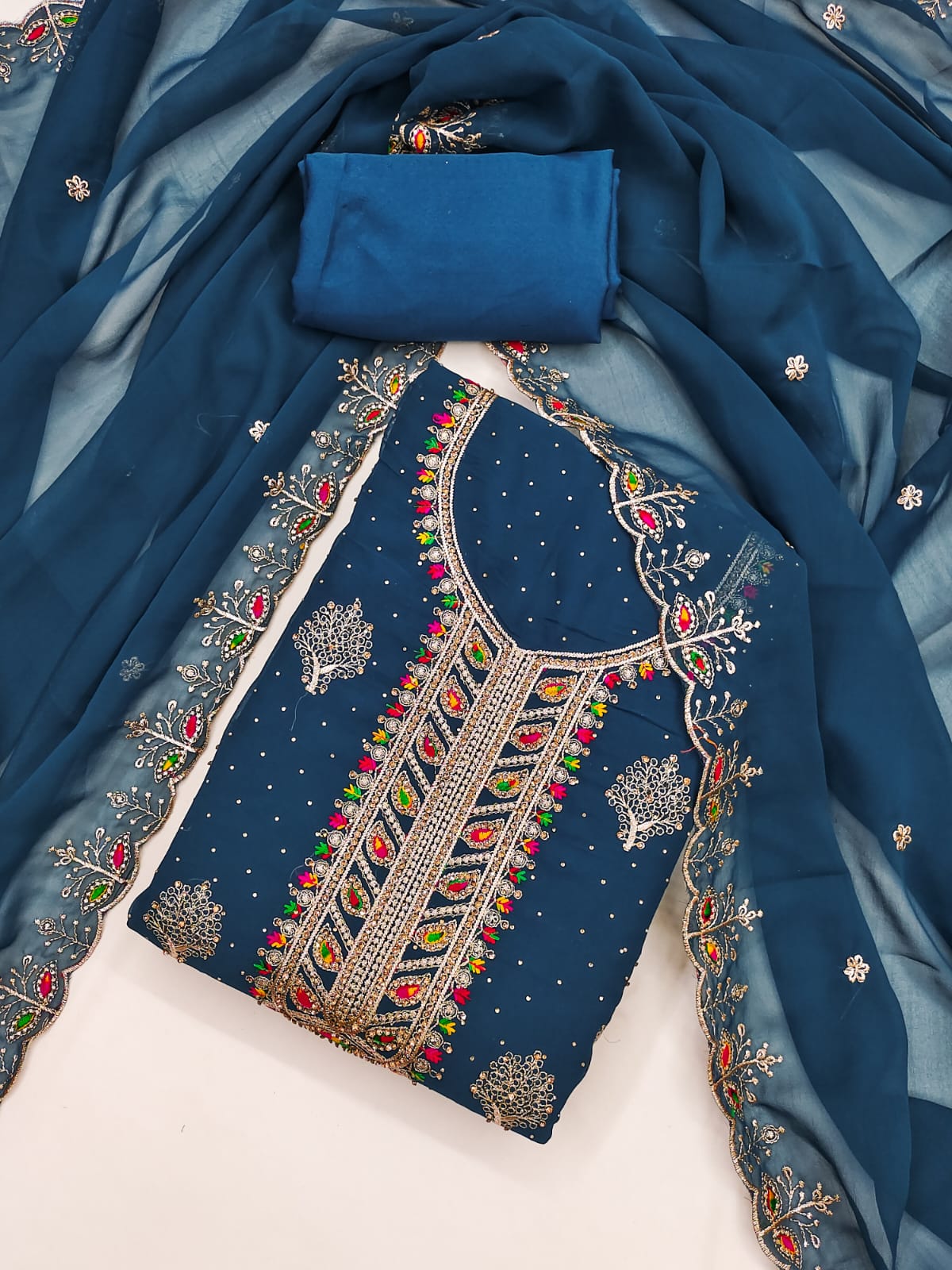 Dupatta: A matching Georgette dupatta adorned with Zari embroidery and diamond embellishments, adding a touch of glamour to your ensemble. Length: 2.1 meters.