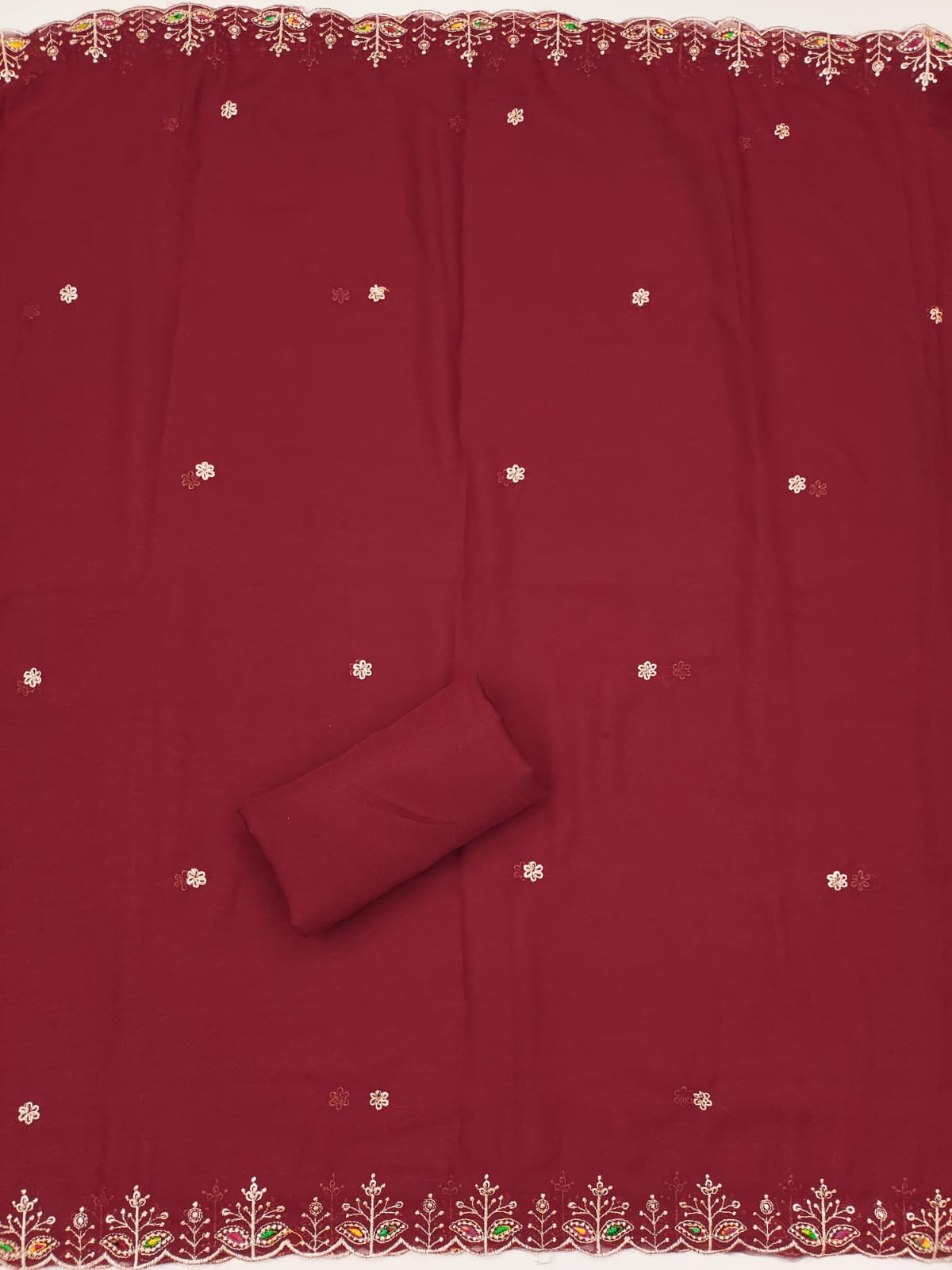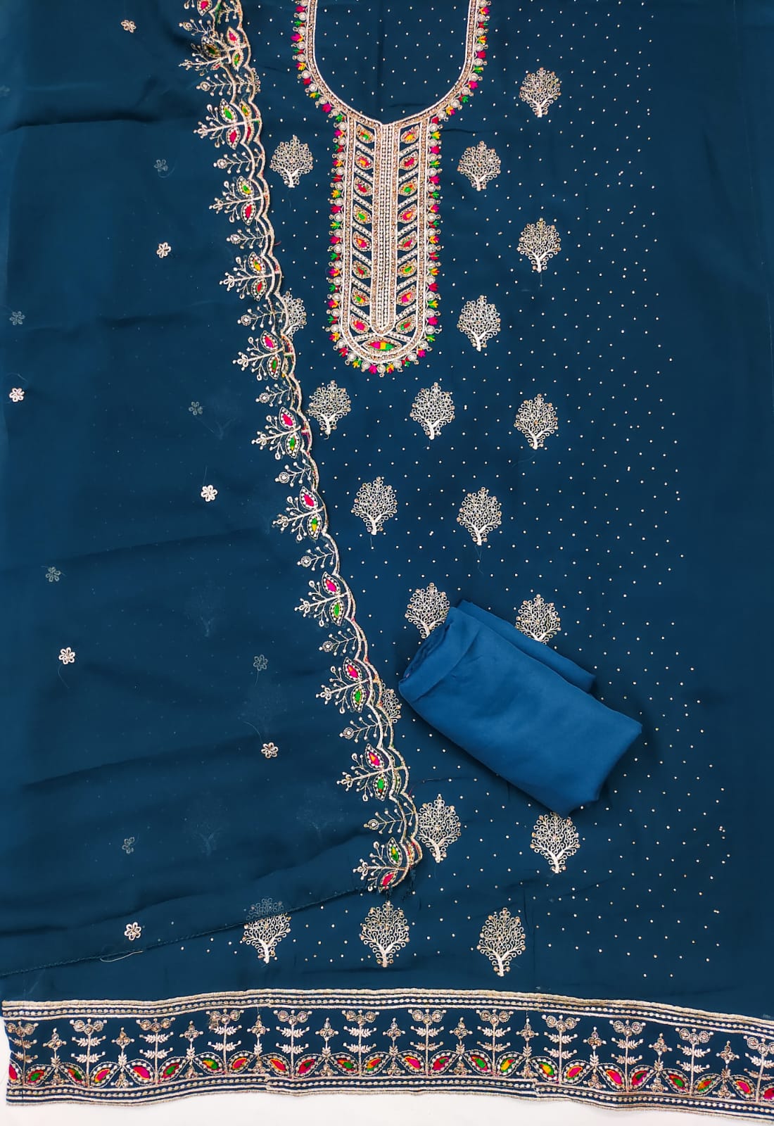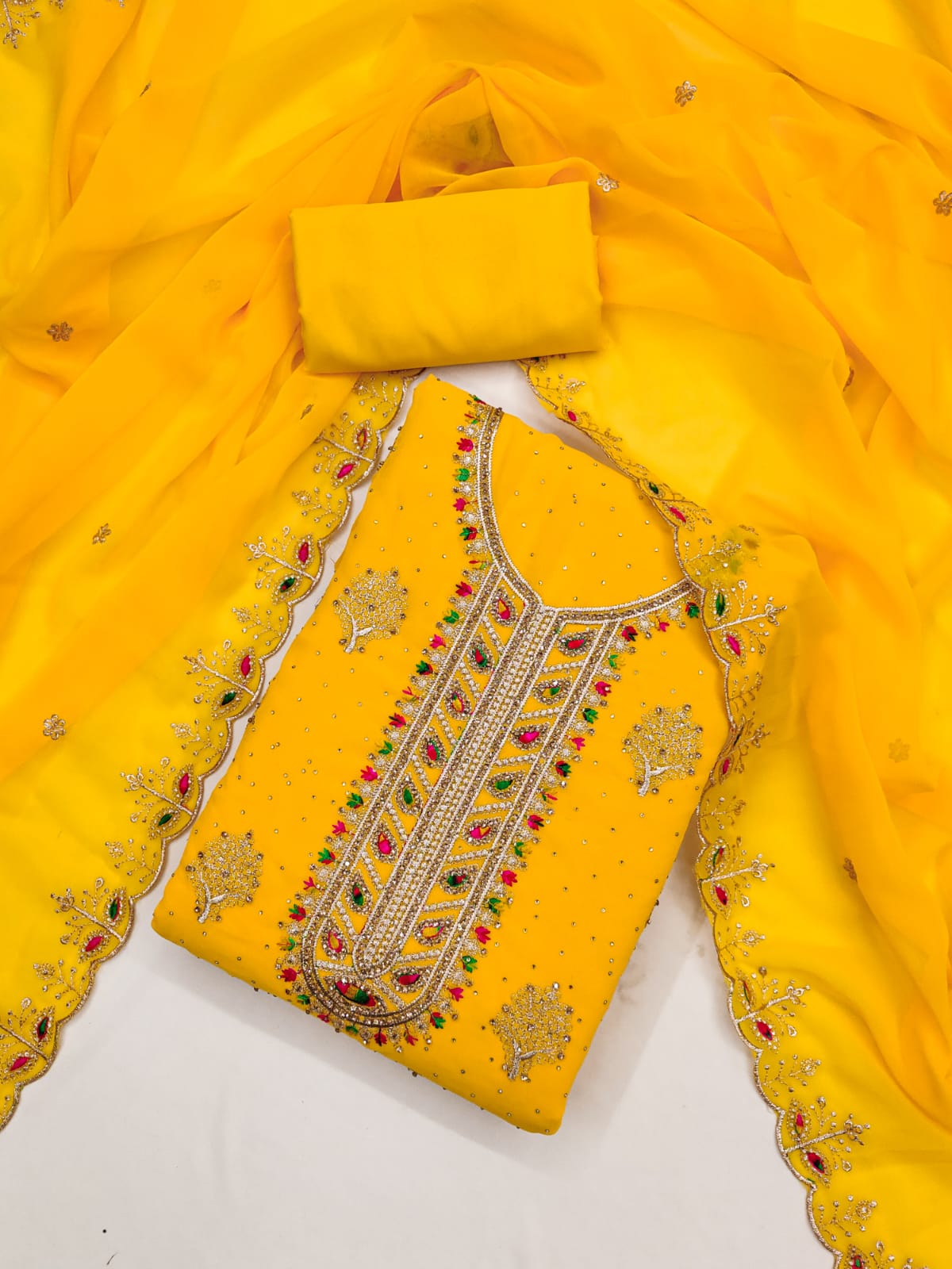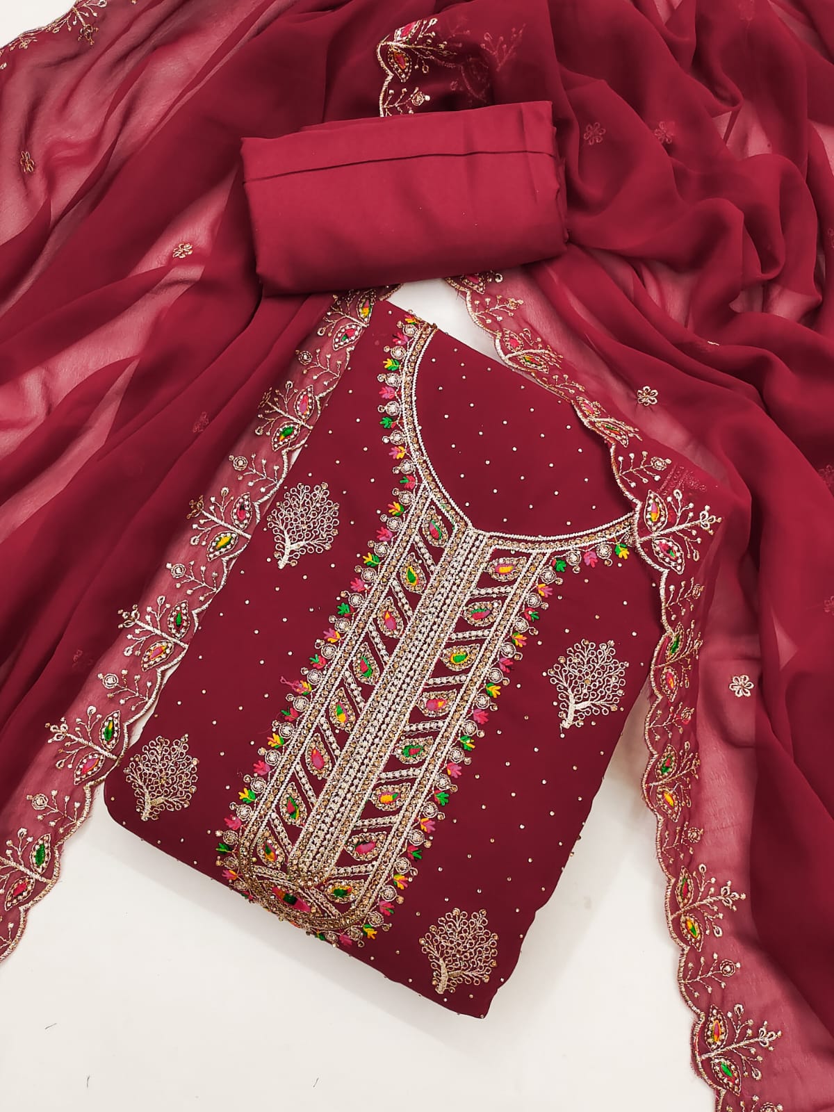 Dupatta: A matching Georgette dupatta adorned with Zari embroidery and diamond embellishments, adding a touch of glamour to your ensemble. Length: 2.1 meters.