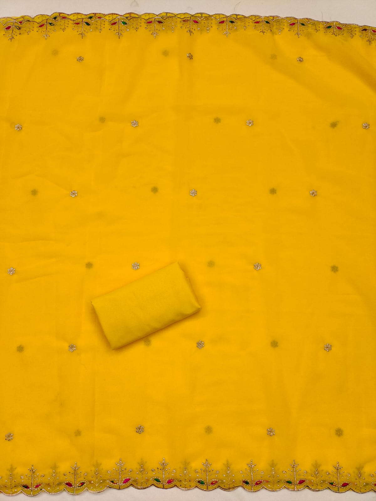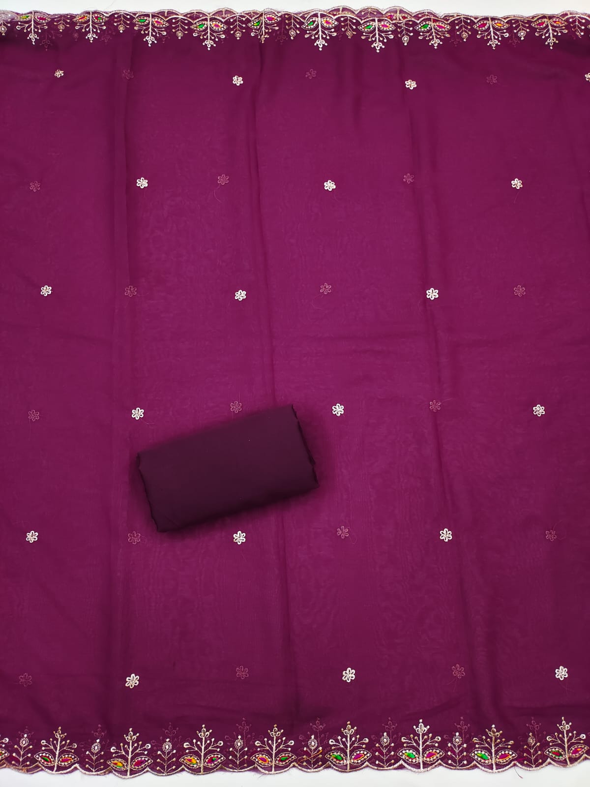 Top: Made from premium Georgette, the top features intricate Zari embroidery complemented by delicate diamond work, offering a luxurious sheen and sophisticated appeal. Length: 2.1 meters.