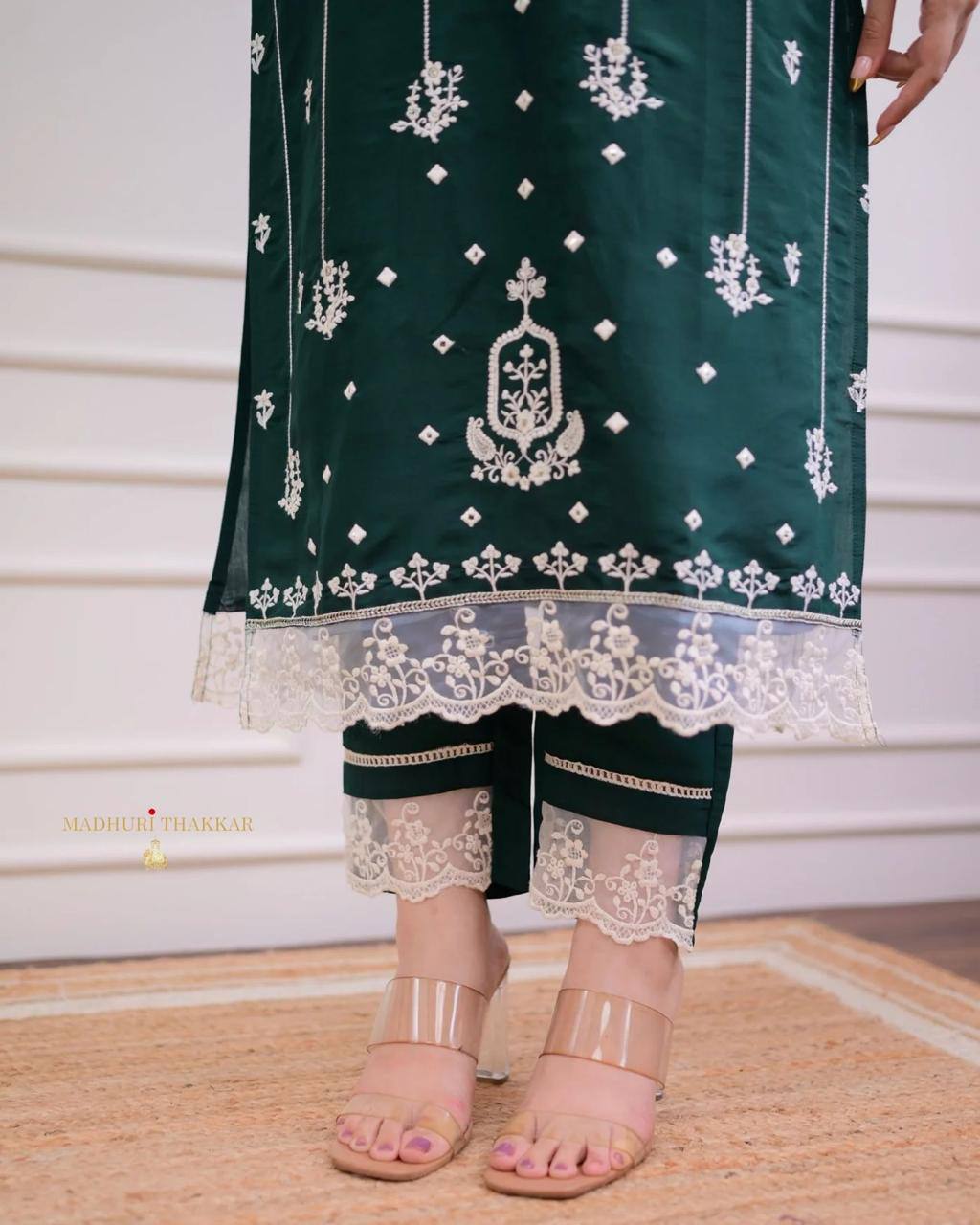 Step into elegance with our exclusive deep green cotton kurta, adorned with intricate white embroidery in floral and traditional patterns. The embroidered neckline and vertical motifs create a graceful, elongated look, perfect for festive occasions or casual celebrations.