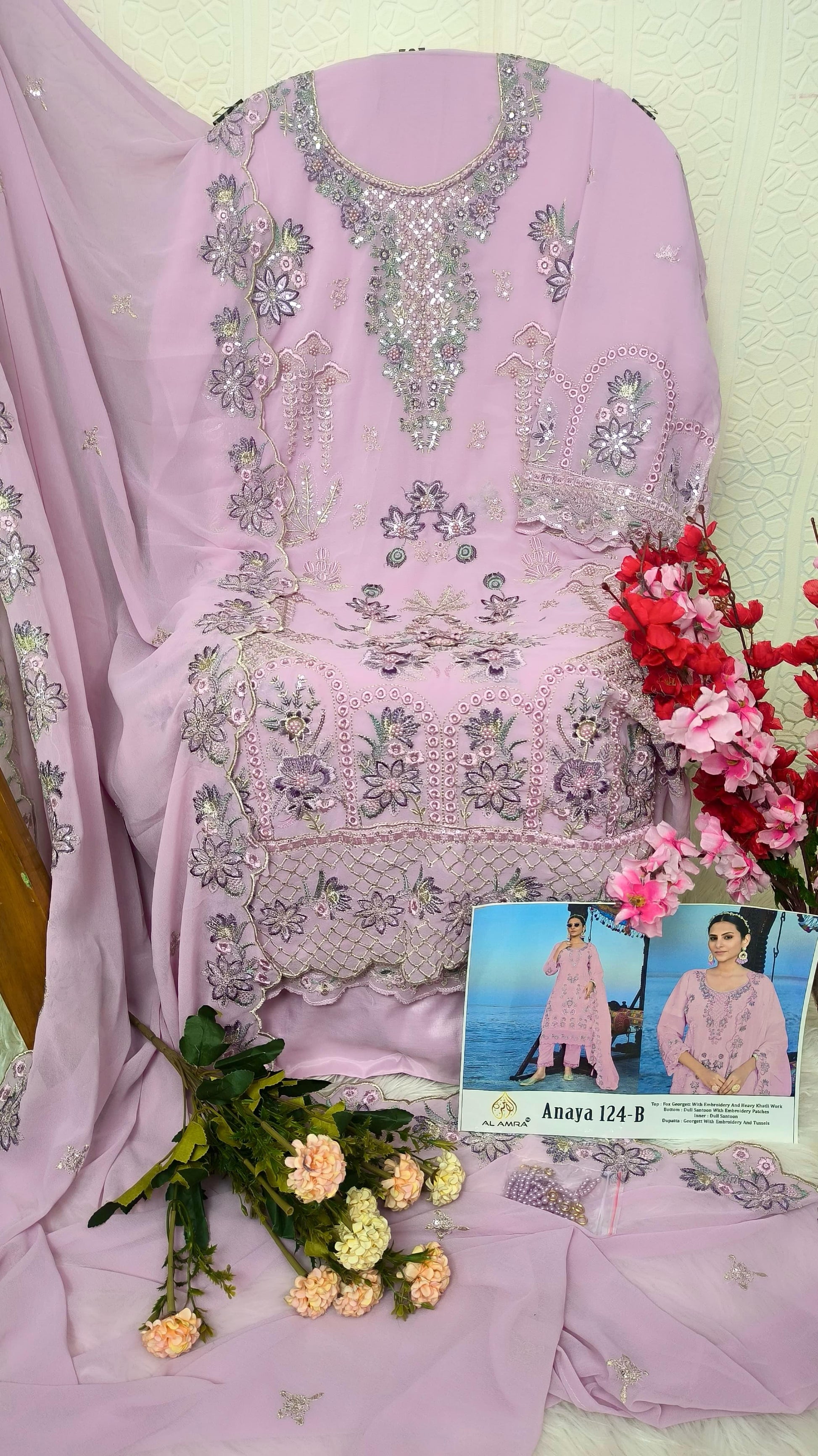 Premium Georgette (Front & Back) adorned with heavy embroidery, shimmering sequin work, and intricate Khatli handwork – making every thread a celebration.-