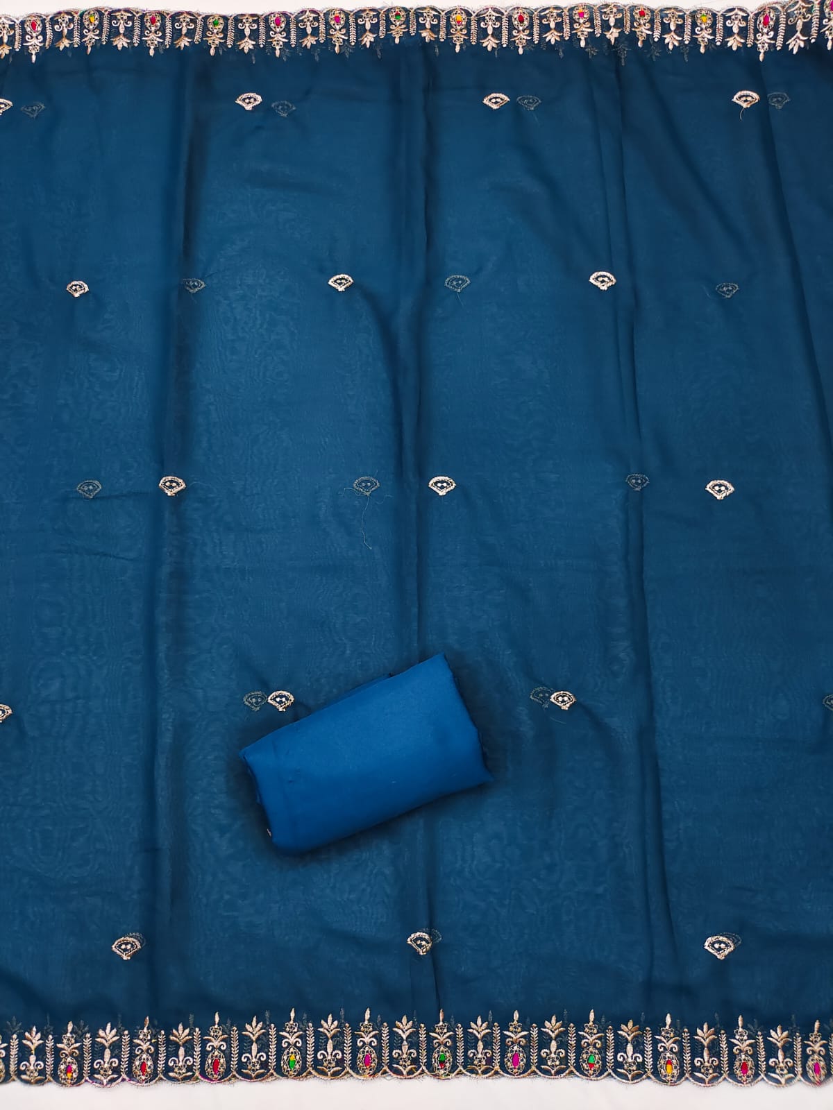 Top: Designed in rich Georgette (2.1 meters), the top features intricate Zari embroidery enhanced with shimmering diamond work, creating a look that is both graceful and glamorous.