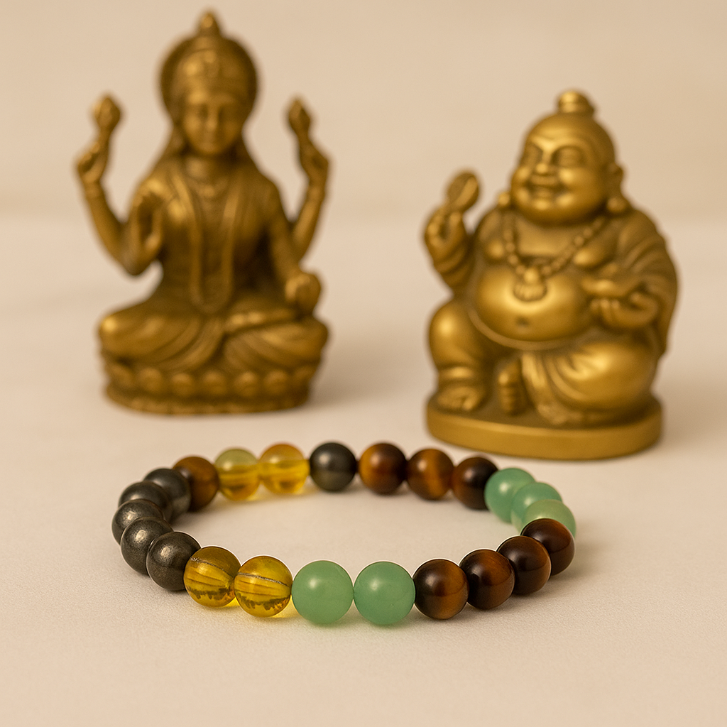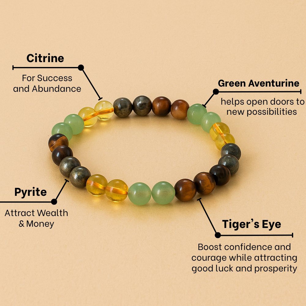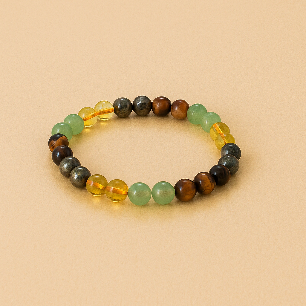 The Money Magnet Bracelet is a powerful accessory designed to attract wealth and prosperity, featuring a harmonious blend of four potent gemstones: Tiger's Eye, Pyrite, Citrine, and Green Aventurine. Each stone is carefully selected for its unique properties, creating a striking bracelet that not only looks beautiful but also serves as a powerful tool for manifesting abundance in your life.