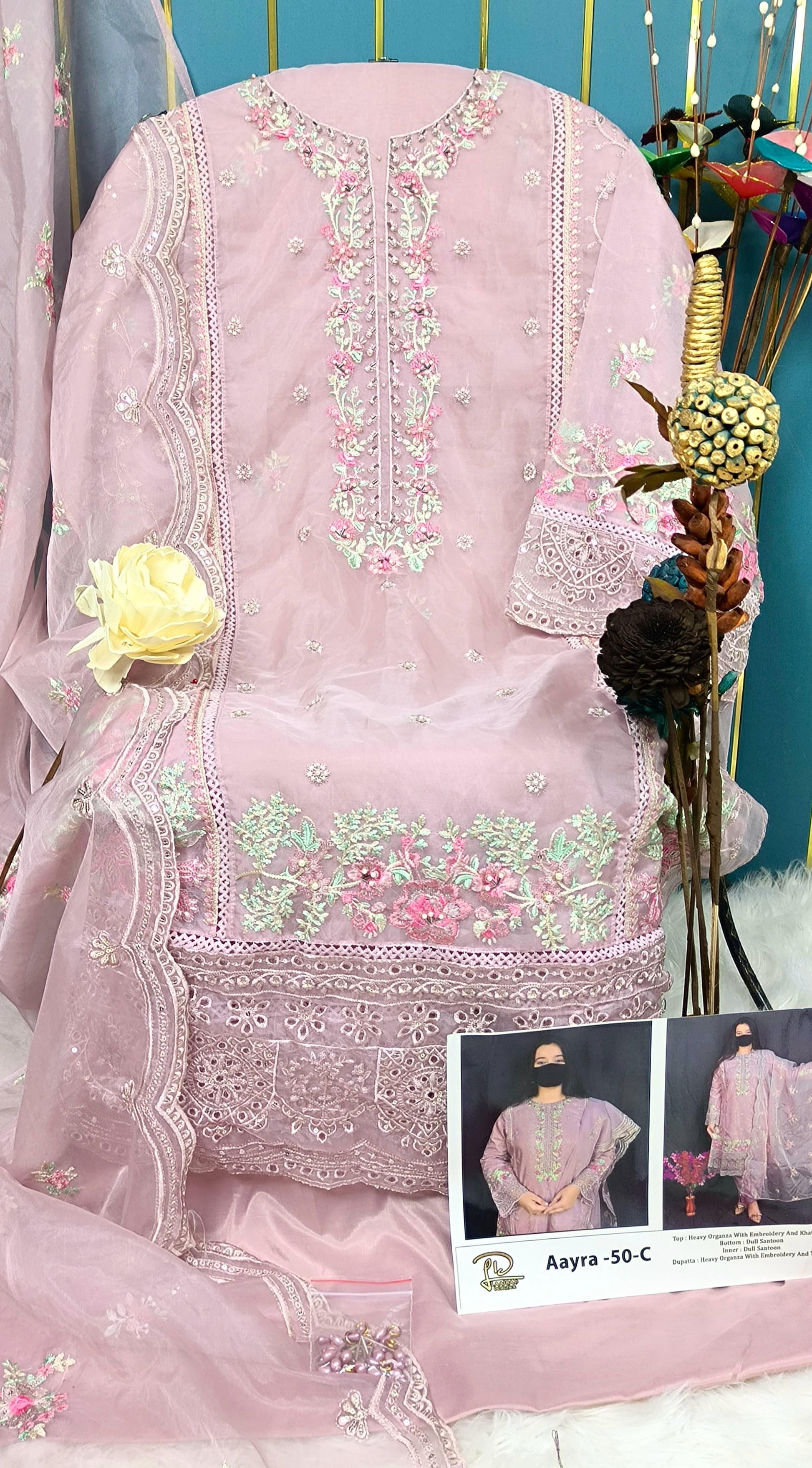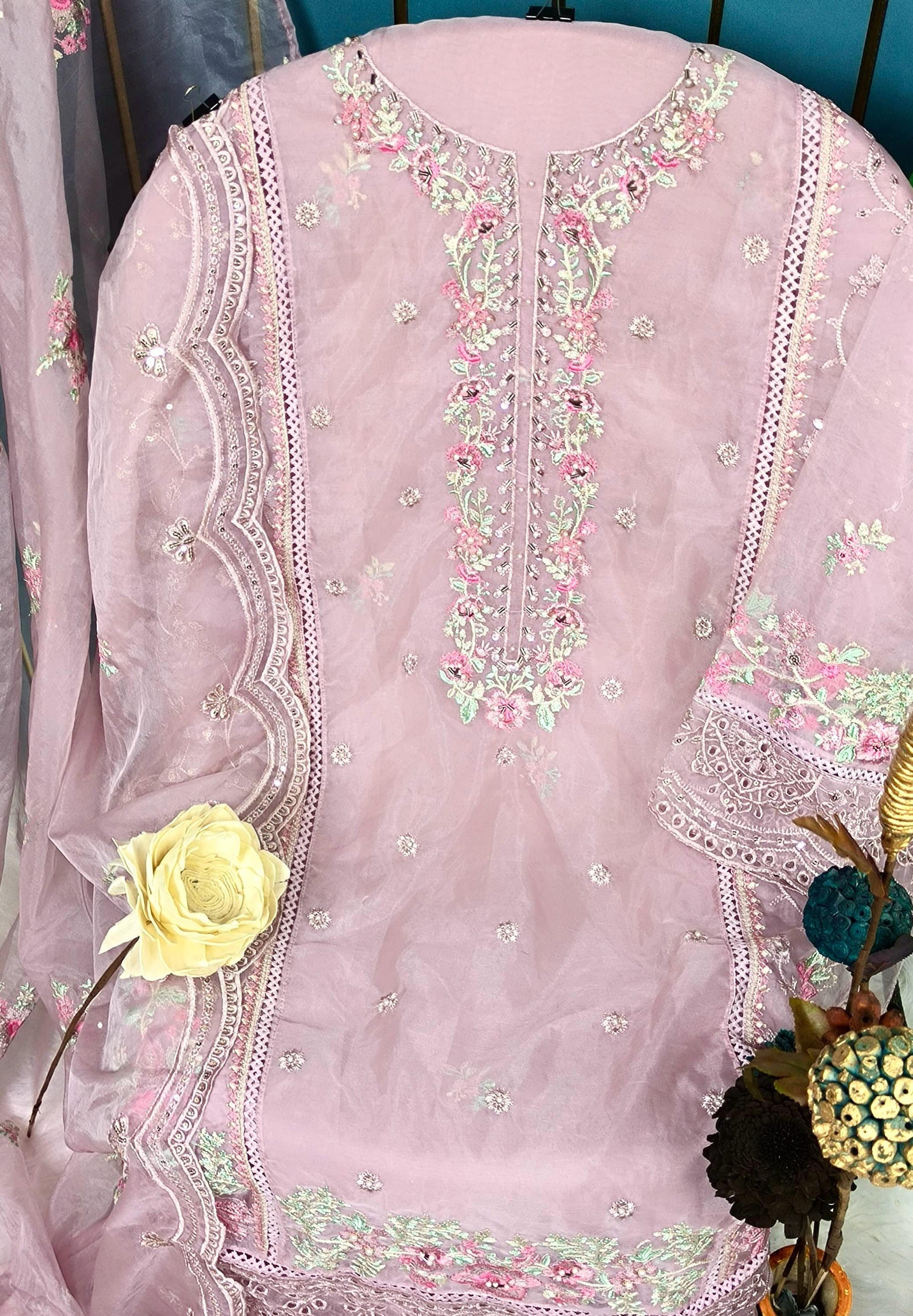 🔹 Top: Heavy Organza adorned with rich embroidery and intricate hand Khatli work – perfect for a graceful, designer finish