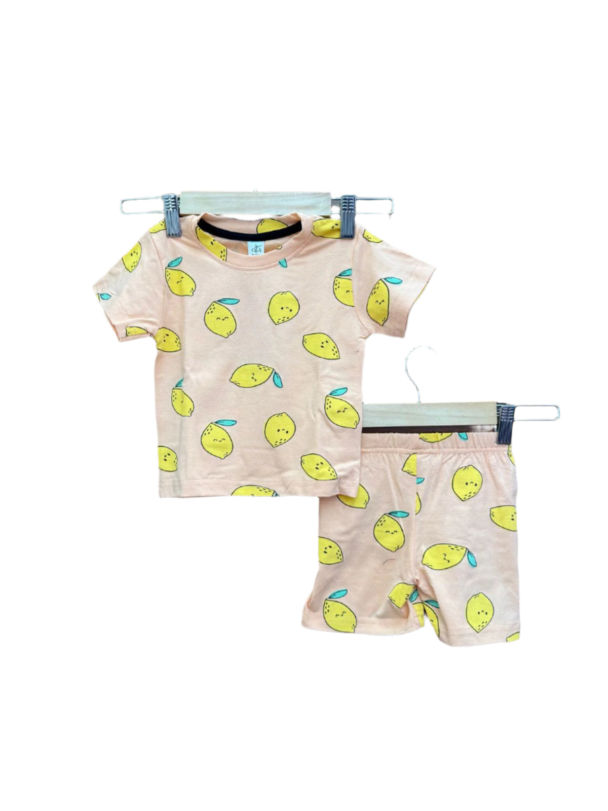 This is a cute and playful toddler clothing set featuring a peach-colored short-sleeve t-shirt and matching shorts.