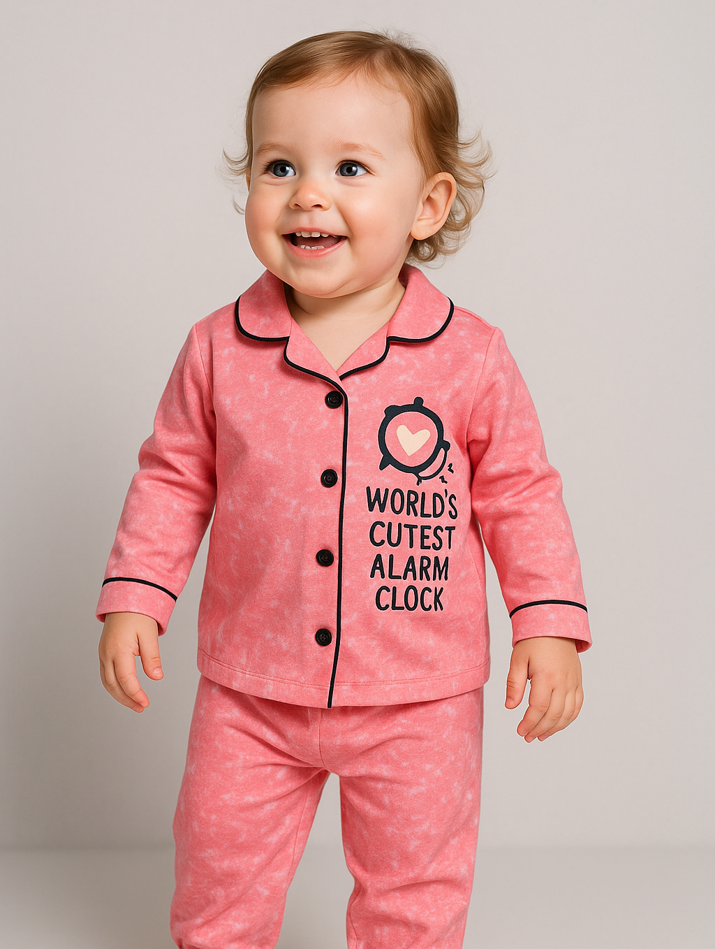 Let your little one drift into dreamland in this adorable pink pajama set! Made from ultra-soft, breathable fabric with a charming tie-dye effect, this cozy outfit features black piping details and a cute "World’s Cutest Alarm Clock" print on the top. Perfect for bedtime snuggles or lazy mornings, it's designed to keep your toddler comfy and cute all night long.